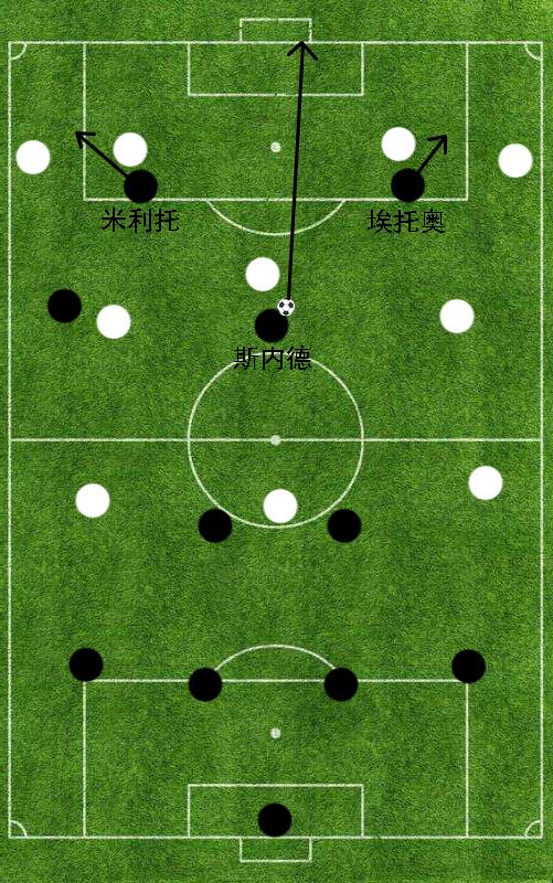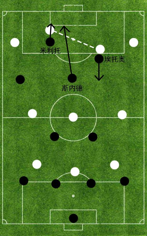 我们再来介绍一下国际米兰的直塞渗透方案,当斯内德在中路得球后,米利托与埃托奥其中之一会稍作后撤,逼迫对方一名中后卫离开小禁区附近。这样一来,对方中路的肋部空档就此暴露出来。与此同时,另外一名前锋立即沿对方肋部空档进行前插要球,斯内德在此瞬息之间既可以进行地面直塞,也可以长传吊身后,球队的进攻就此呈现出极有层次感的态势。