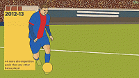 梅西与2013年金球奖失之交臂,但这仍是一个非同寻常的赛季,他获得欧洲金靴奖,虽无法与上个赛季的纪录相比,但2012-13赛季才是他非凡的进球能力的巅峰。