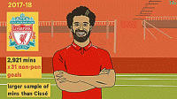 或许更恰当的对比是穆罕默德·萨拉赫,2017-18赛季,在利物浦的首个英超赛季中,萨拉赫在2921分钟的比赛中,攻入了31个非点球进球,这是一个更大的时间样本,消除了替补的影响,即使这样仍然有一定距离。