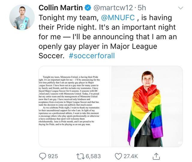 而罗杰斯的同胞,1994年出生的科林-马丁,也在2018年公开出柜,他是美国五大体育联赛中唯一一名现役出柜球员。