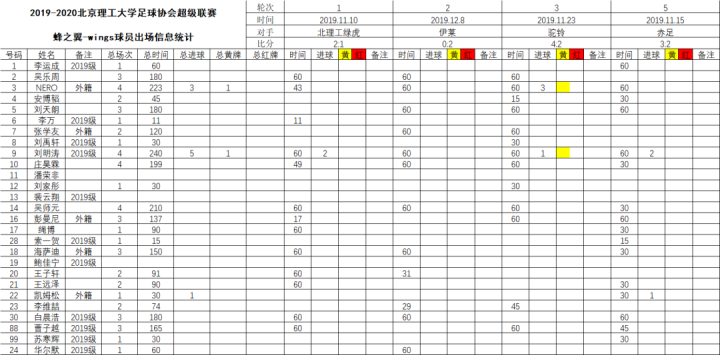 第二,要让每一位球员意识到,他们是这个联赛的一份子。本赛季的联赛虽然因为新冠疫情腰斩,但是北理工足协所建立的数据库留存着每一场比赛的数据,在赛季结束后以球队为单位绘制出赛季数据总结表。