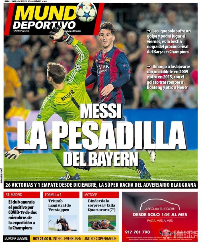 诚如《世界体育报》头版标题,“梅西是拜仁的噩梦”。在2009年(4-0)和2015年(3-0)的欧冠淘汰赛中,梅西都在拜仁身上“梅开二度”。