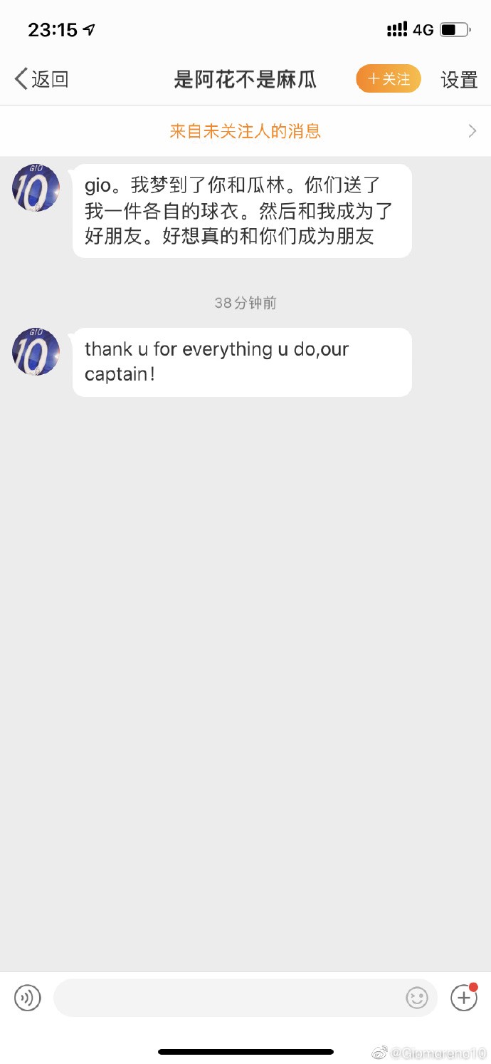 莫雷诺在赛后晒出了这位ID名为“是阿花不是麻瓜”的申花球迷的私信内容,这位球迷告诉莫雷诺,曾梦到他和瓜林各自给自己送了一件球衣。