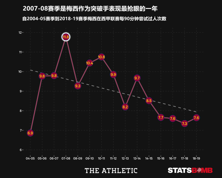 梅西当时每90分钟的成功过人次数为8.6次,这意味着他的过人成功率为73%。然而这却不是他生涯的最佳数据,2005-06赛季76%的成功率足以显现他优异的效率,而他在那个赛季的场均过人次数也仍然排在生涯前三。