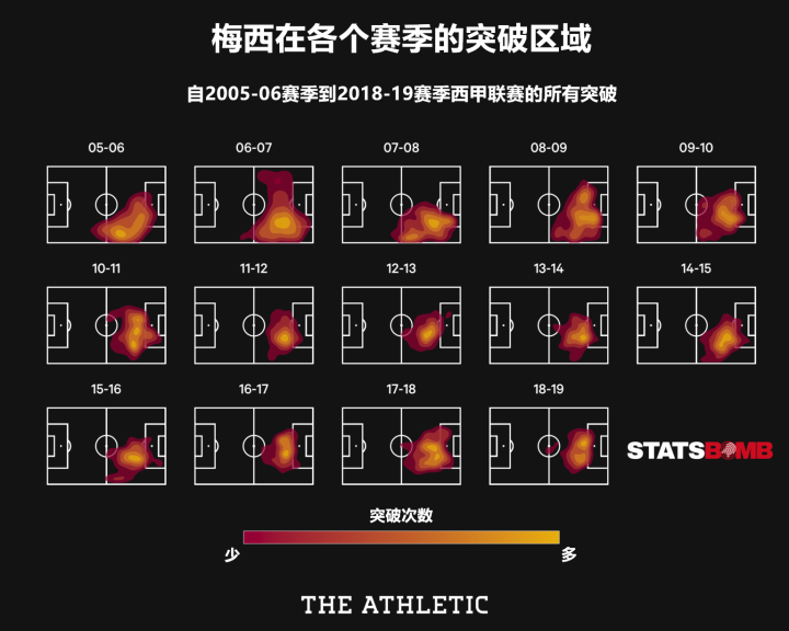 在盘带过人的话题上,数量和效率是一方面,但更能显现梅西不断进化的是他在职业生涯中过人区域的变化。下图展示了不同赛季里梅西尝试过人的热区图。