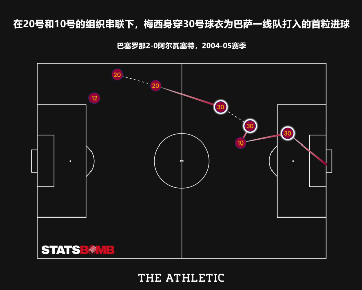因此,左脚为力足的梅西从来没有尝试过在左边路踢球,巴萨上一次在这个位置使用左脚球员可能还要追溯到范加尔时代,通常情况下,左脚球员都更适应在右路内切进攻。当梅西进入到巴萨一线队后,从本质上讲他就是完全复制了罗纳尔迪尼奥的角色。在下图中可以看到,梅西的处子进球是在范布隆克霍斯克(12号)和德科(20号)的组织串联后,最终由罗纳尔迪尼奥(10号)完成了助攻。