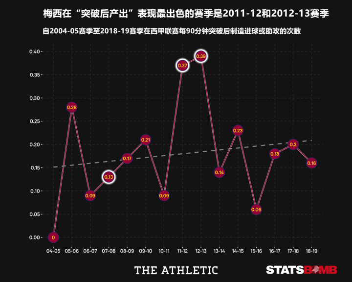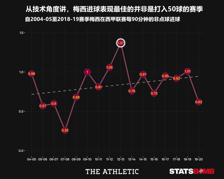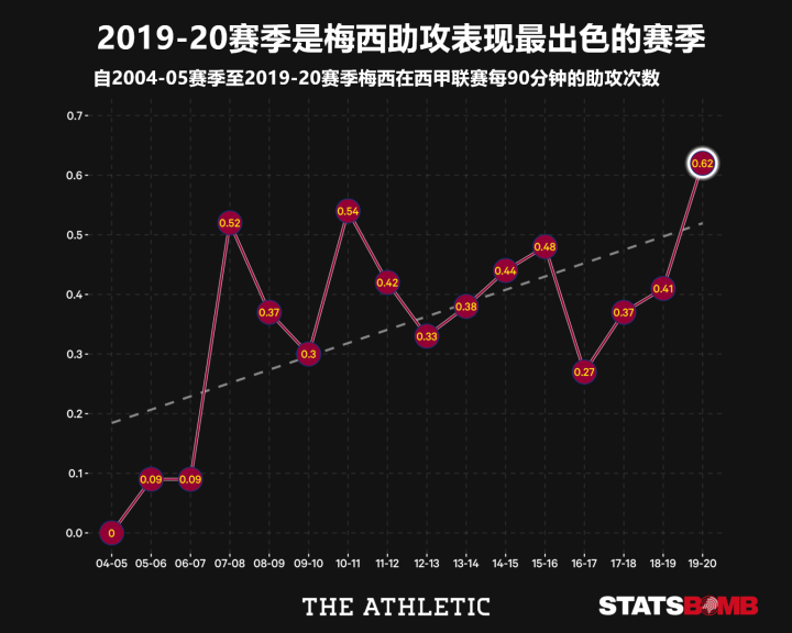 在本节的第一张图中的情况来看,梅西的助攻呈现出上升趋势,不过从实际情况来看,阿根廷人在职业生涯中的助攻表现是有所波动的,但他的表现始终徘徊在优秀与伟大之间。