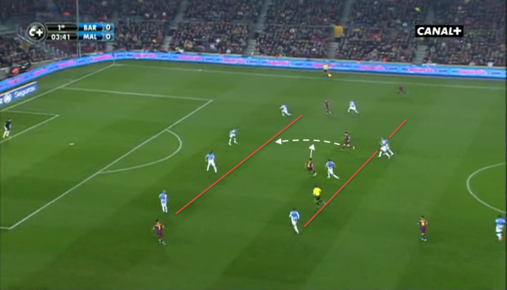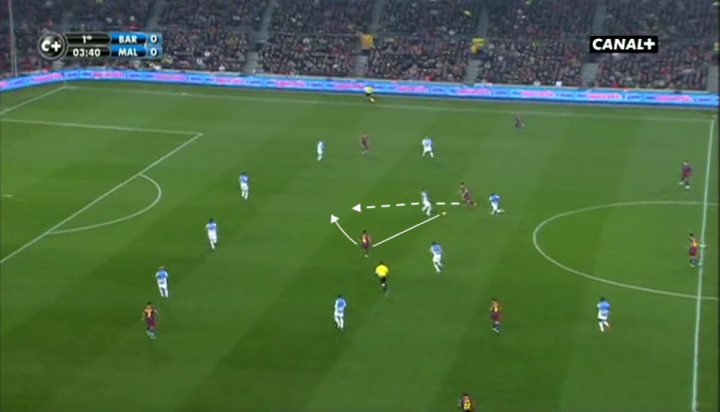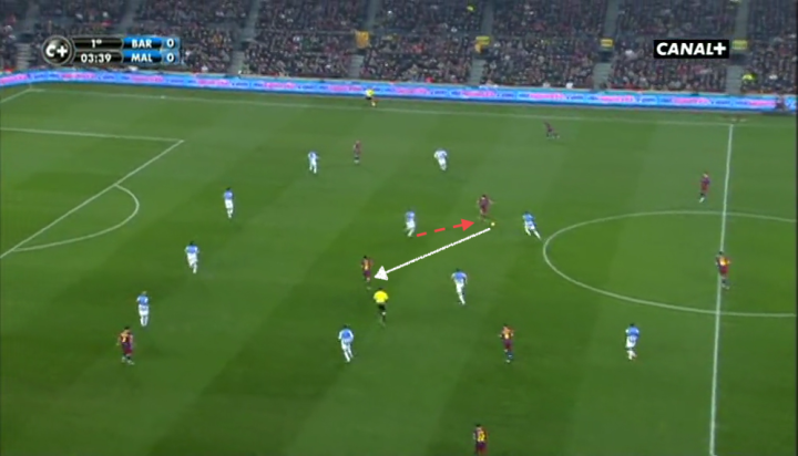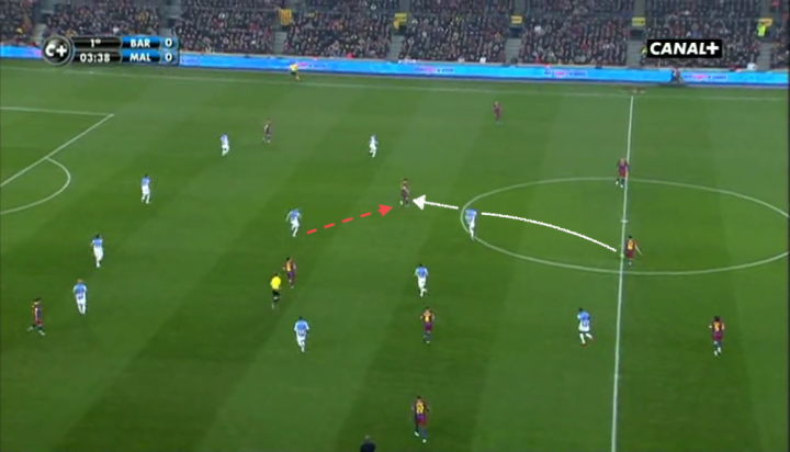 马拉加的卡马乔见梅西得球后迅速跟进防守,但这也令他身后的哈维处于无人盯防的状态,后者也在第一时间开始跑位。