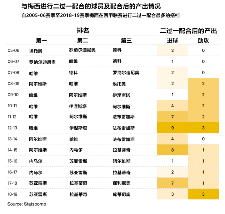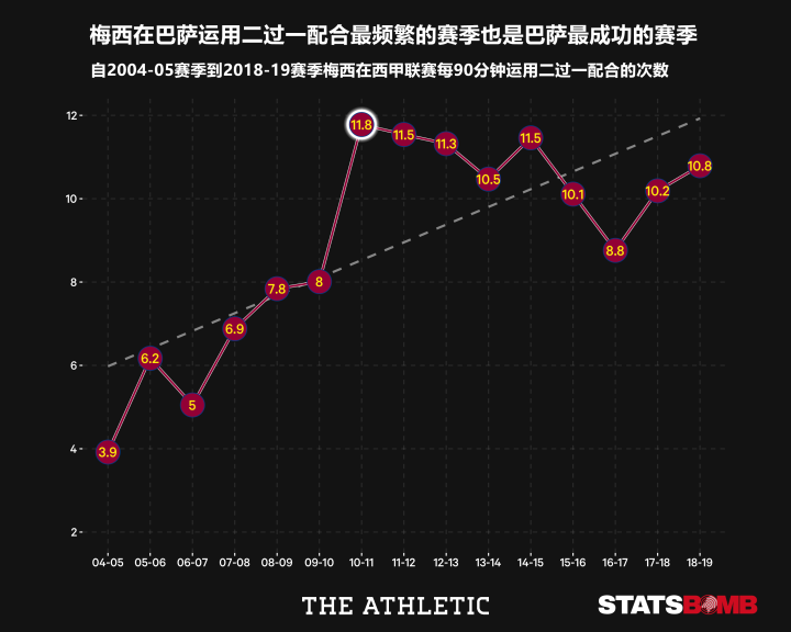 2012-13赛季的梅西通过二过一配合完成了9球3助攻的数据,这也自然成为了他在这方面能力表现最突出的赛季。