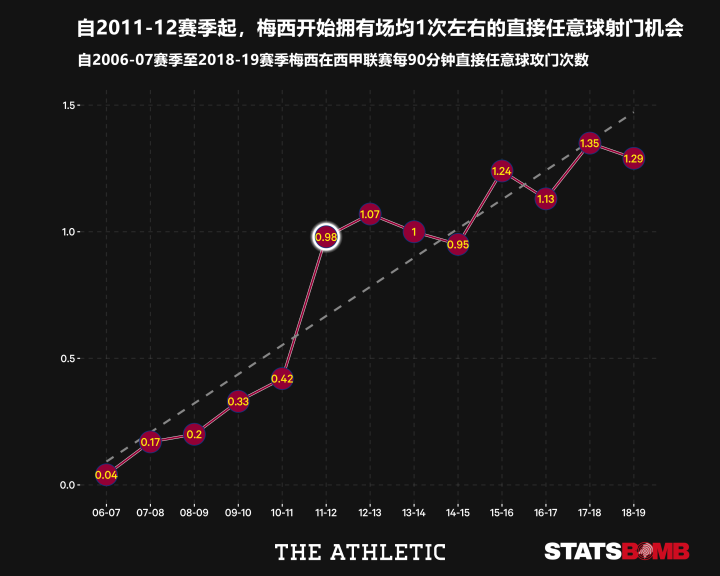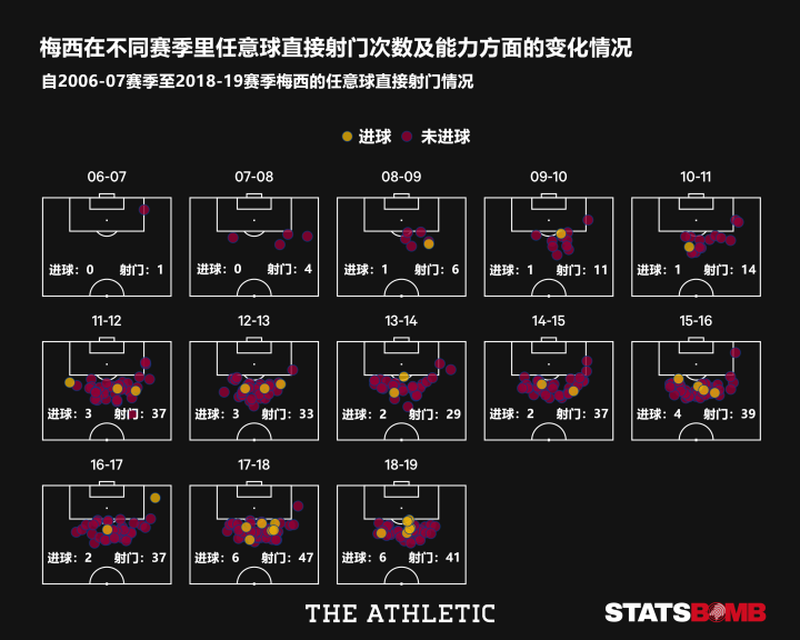 从2006-07赛季到2010-11赛季,梅西在这5个赛季里共计主罚了36个任意球,罚入3球。每12次任意球射门转换1粒进球的表现已经是非常不错的表现,梅西当时的任意球得分转化率是8%,而期望进球模型中的数据则为2.3球,对应的期望转换率只有6%。