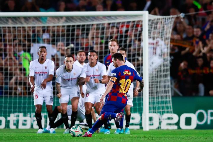2018年12月,梅西对阵西班牙人的加泰罗尼亚德比中完成了任意球梅开二度,点燃了全场的激情。其中第一球是距离球门25码左右的中路位置,皮球在绕过人墙后直飞球门右上角,令门将迭戈-洛佩斯鞭长莫及。