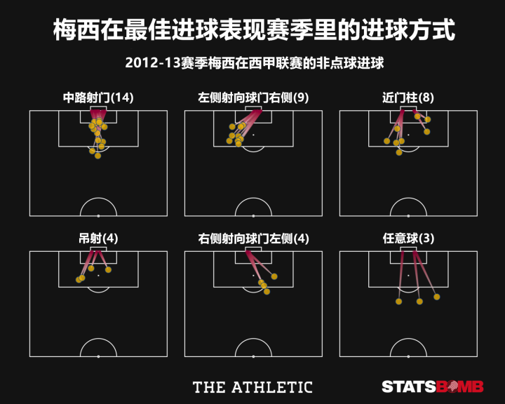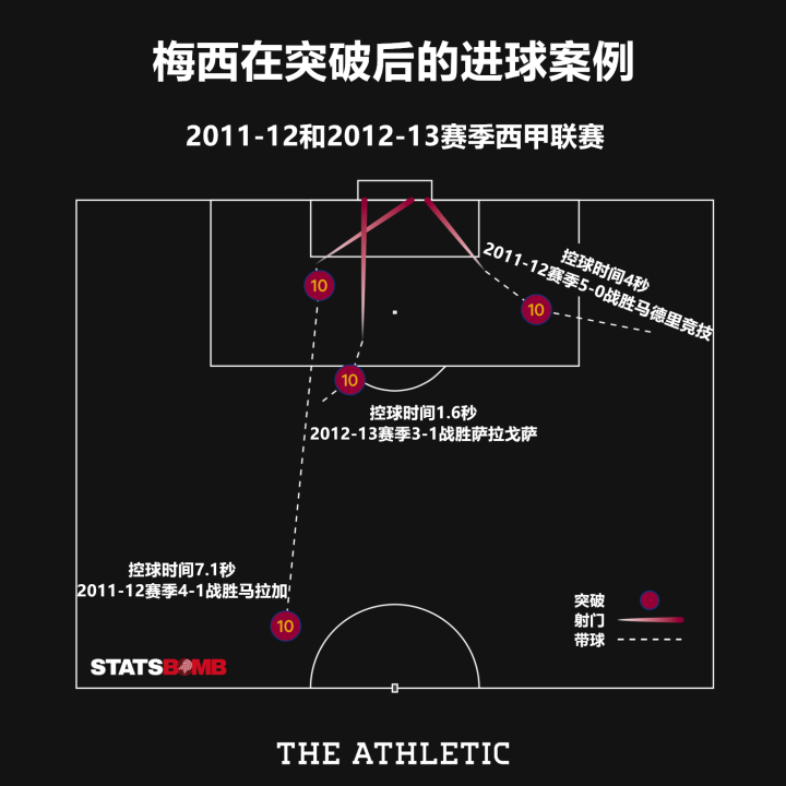 在2011-12及2012-13赛季,梅西在过人后的完成的进球从未超过8秒。从下图所展示的进球来看,梅西的跑动速度和思路帮助他在球场的各个位置破门。