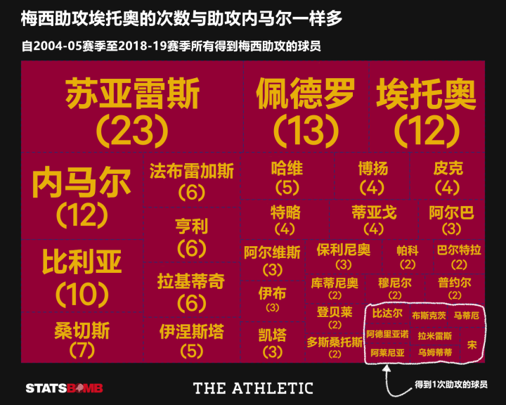 在本赛季之前,梅西每90分钟助攻数的最佳纪录出现在2010-11赛季,当时他送出的助攻都指向了队内的西班牙球员:博洋为3次,皮克1次,佩德罗4次,蒂亚戈2次,比利亚则为8次。