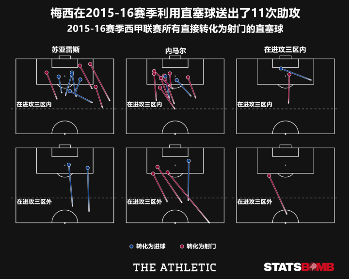 2015-16赛季的梅西同样在直塞球成功次数上迎来了生涯巅峰,直塞球直接转化射门及进球的次数亦是如此。在那个赛季梅西完成的52记成功直塞球里,有27次转化为射门,其比例稍稍超过五成;而在这27次转化射门的直塞球里,又有11次转化为进球。这些直塞球的接球对象主要是苏亚雷斯和内马尔,梅西总能用传球撕开对方的防线,有时候甚至是在很深的位置。