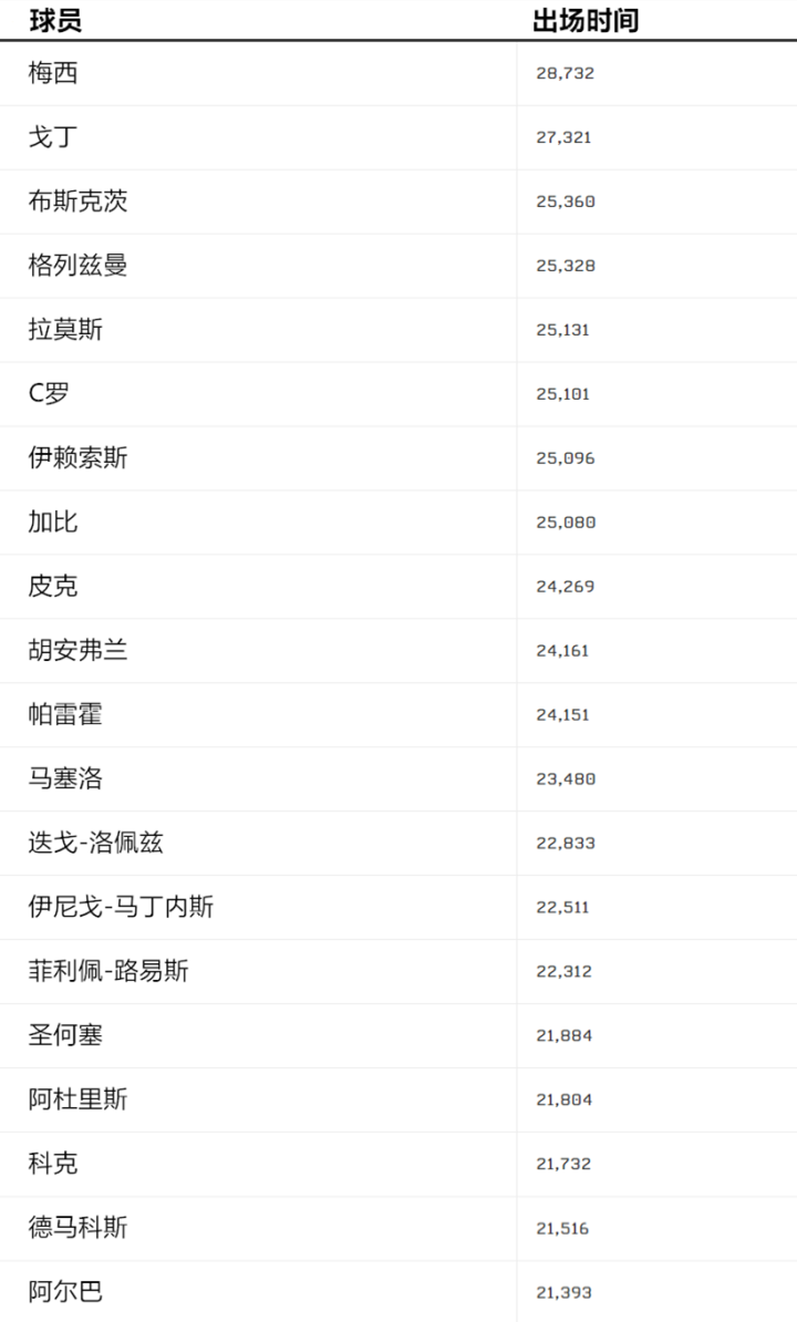 梅西的出场时间高居第一,比第二名更是高出了相当于15场半的比赛时长。对于一名总是奉献高光表现,暴露在对方一次次强硬铲断之下的球员来说,这是一个颇为难得的成就。