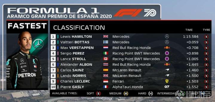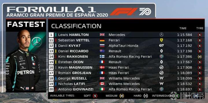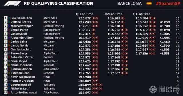 2020赛季F1西班牙大奖赛排位赛成绩排名:1....就是C罗 @懂球帝2020-08-15 22:262020赛季F1西班牙大奖赛排位赛成绩排名: 1.汉密尔顿 2.博塔斯 3.维斯塔潘 4.佩雷兹 5.斯托尔 6.阿尔本 7.塞恩斯 8.诺里斯 9.勒克莱尔 10.加斯利 11.维特尔 12.科维亚特 13.里卡多 14.莱科宁 15.奥康 16.马格努森 17.格罗斯让 18.拉塞尔 19.拉提菲 20.吉奥维纳兹展开更多