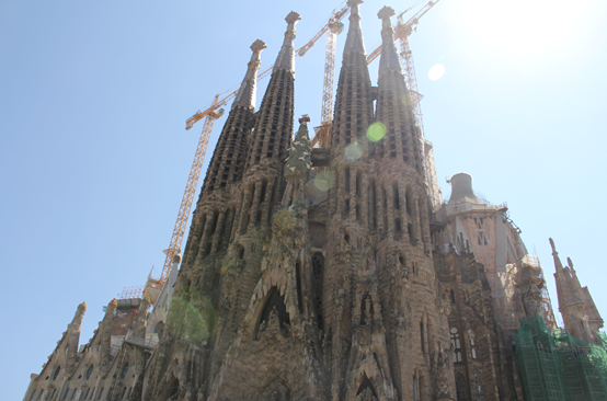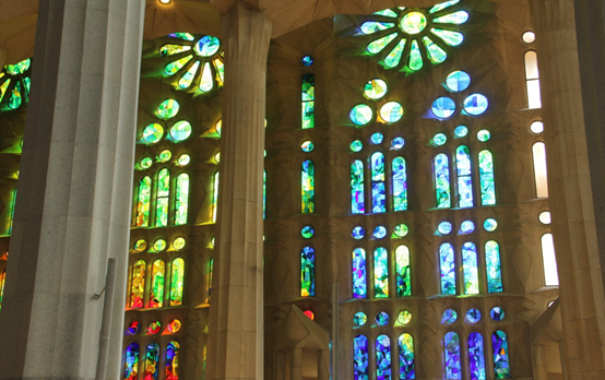 离米拉之家不远,即是大名鼎鼎的圣家族大教堂,也是唯一一个至今尚未完工但已经被列入世界文化遗产的建筑。进入这里,近距离感受这位天才的建筑大师的想象力,传统的哥特式立柱高耸入云,无数的立柱像树干一样支撑起天花板,屋顶和四周的彩色玻璃窗是整个教堂最耀眼的部分,随着太阳的转动,随时都有万花筒般的光线照射进来。沐浴在暖色的光线下,看着耶稣受难的雕塑,无法不在那一刹那感到上帝的荣光和伟大。如今,高迪被安葬在圣家族大教堂的地下,静静地凝望着自己最完美的一件作品,在时光中不断雕琢,在岁月中摄人心魄。