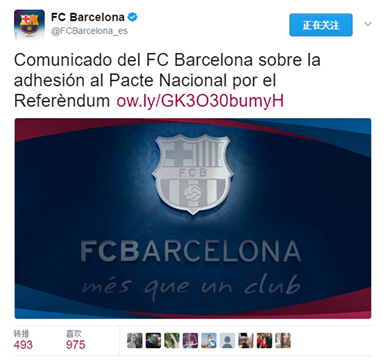 2017年5月6日,巴萨官推宣布支持“国民公投条约”,支持加泰人投票决定加泰罗尼亚的政治前途