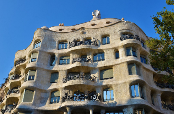 从古埃尔公园出来,沿着德格拉西亚大街往海边走,不多时便能看到一幢风格明显的建筑,墙面起伏不平,屋顶错落有致,还有各种奇奇怪怪的凸起物,这便是闻名世界的米拉之家,高迪的另一件完美体现其浪漫主义精神的作品。