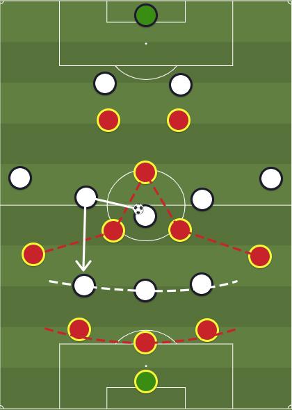 如上图所示,当沃克在进攻过程中前插,曼城在右边路的中后场防守将会暴露出巨大的身后空档。一般来讲,边卫插上后留下的身后空档应当由右边前卫或是靠右的那一名后腰进行补防,但曼城在那一场比赛使用的右边前卫京多安习惯性的内收到中路,没有办法第一时间赶到边路进行补防。