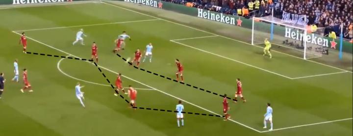 如我们所说,曼城的右边路防区成为了利物浦的主要攻击对象。早早取得领先后,红军利用曼城较为焦躁的进攻心态,将三条阵线进行大幅度的后撤,转而使用瓜迪奥拉最为头疼的防守反击战术。