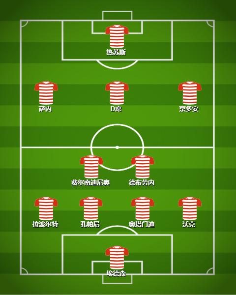 在对阵里昂的比赛中,瓜迪奥拉继续主动改变阵型,他祭出了一个不太标准的352阵型,由费尔南迪尼奥、加西亚以及拉波尔特充当球队的三后卫;在中场区域,罗德里位置拖后,京多安稍稍靠前,德布劳内则处于最前方;在前锋线上,热苏斯充当球队的正印中锋,斯特林则埋伏在其身边伺机突击。