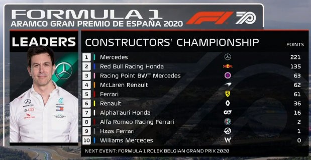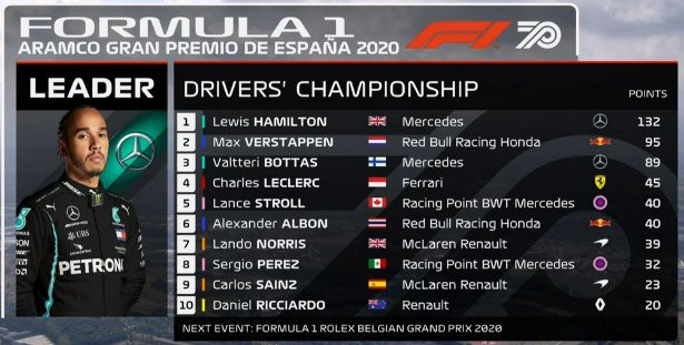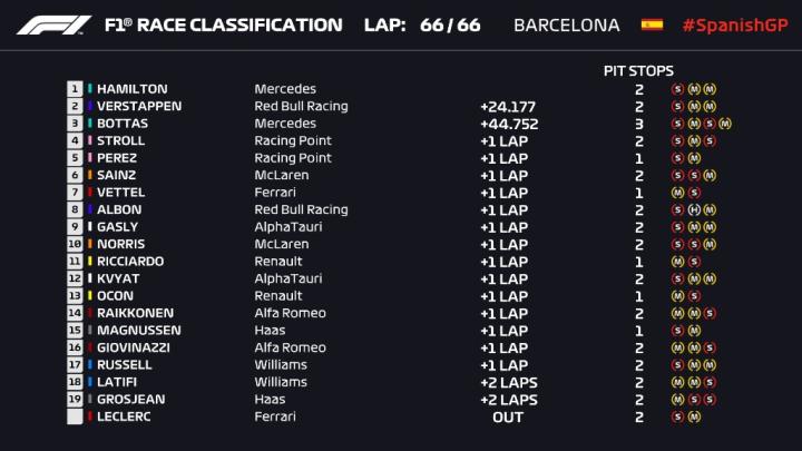 西班牙站的赛道不是很利于超车,冠军的悬念也几乎在一开始就消失了。起步阶段,第三位发车的维斯塔潘超掉了第二位发车的博塔斯,而这样的排名也一直保持到了比赛结束。