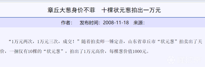 一旦评上了“葱王”,这捆葱也像金榜题名一样镀了金,在2008年那个还没有微信微博的年代,一捆状元葱拍了一万人民币,一根一千。