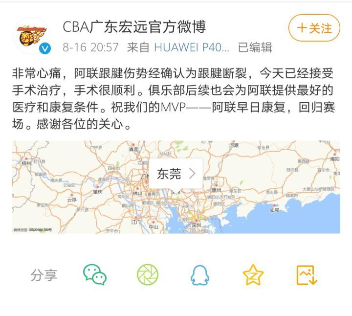 第二天,北京时间8月16日,广东宏远篮球俱乐部通过官方社交媒体账号进一步印证了大家的猜想:易建联的伤势确认为跟腱断裂,并于当天接受了手术治疗。