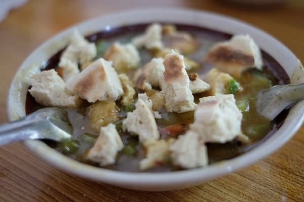 吃的时候,要把饼子提前掰碎了放进碗里,再浇上一勺胡辣汤。