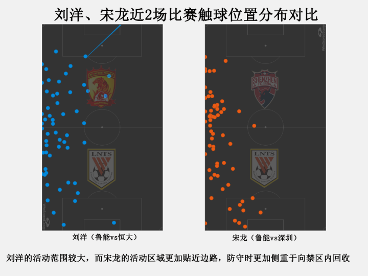上图是两人在最近比赛中的触球位置分布,从中不难发现两人数据差距的原因所在。宋龙的活动区域更加靠后,在防守中侧重于向中路收缩保护,上抢、拦截的机会不多;而刘洋的活动范围比较大,防守重心主要集中于边路,能够让球队的防线整体向外扩展。