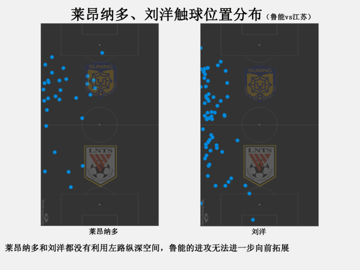 但从两人的触球位置分布来看,刘洋和莱昂纳多谁也没有去利用纵深方向的空间,这也让球队失去了继续向前拓展进攻的可能。如果是出于对江苏攻击力的忌惮,这个任务交给宋龙来完成显然更为合适。