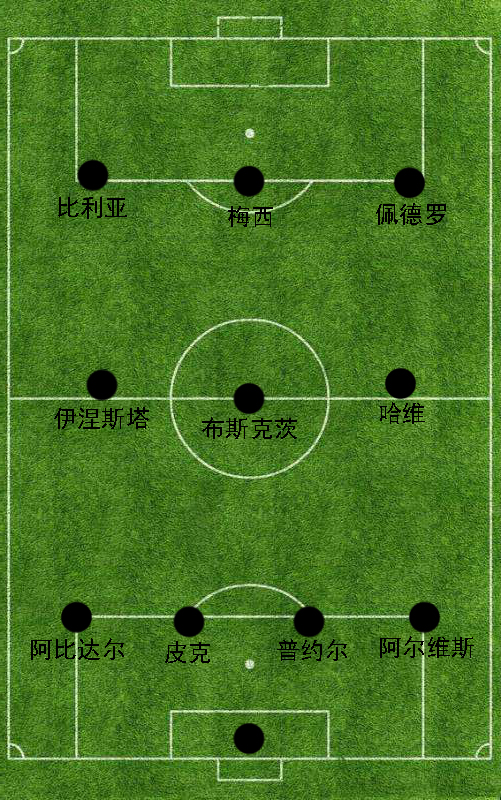 一般来讲,瓜迪奥拉喜欢将梅西放置在中锋位置,左右两边的两名边锋则分别选择7号比利亚以及17号佩德罗;在中场区域,16号布斯克茨成为球队的单后腰,处于他身前更多负责进攻的两名选手便是大名鼎鼎的黄金搭档--哈维+伊涅斯塔;在后卫线方面,3号皮克以及队长5号普约尔是球队的双中卫,在他们两人身旁的两名边后卫则分别是22号阿比达尔以及2号阿尔维斯。