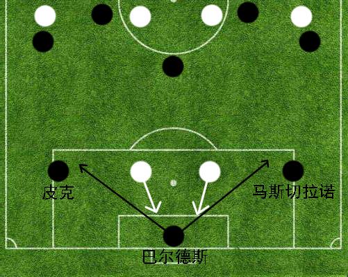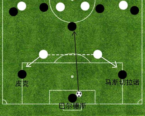 由于当时绝大部分西甲球队都是双前锋阵型的坚实拥戴者,因此巴塞罗那这种战术策略可以在后场区域形成短时间内的3对2有效进攻局面。一旦对方的两名前锋选择将身位拉开限制皮克以及马斯切拉诺的要球,巴尔德斯就会选择将皮球径直输送到两名边后卫或是中场回接的后腰脚下;如若对方逼抢的两名前锋选择忽略皮克以及马斯切拉诺的拉边,转而径直上压对于门将实施逼抢,巴尔德斯就会第一时间将皮球交到皮克或是马斯切拉诺的脚下,从而打出更加具有层次感的分边战术。