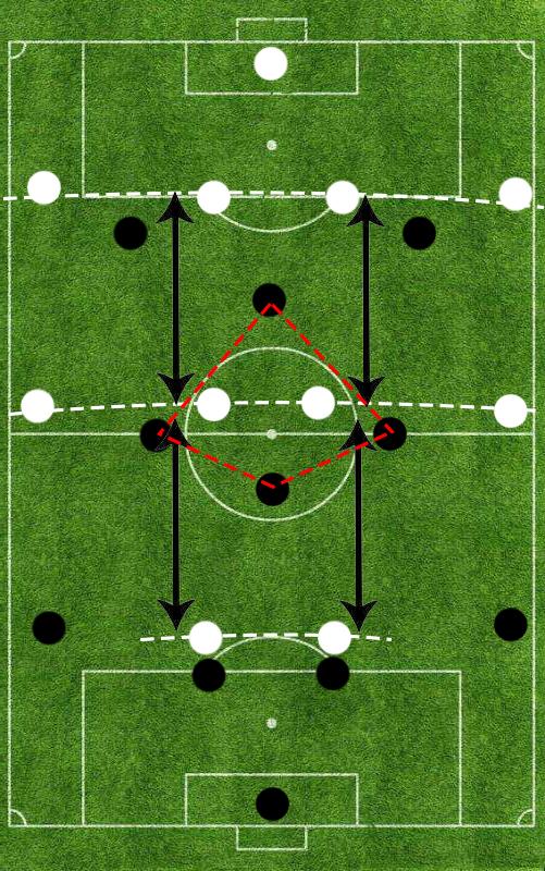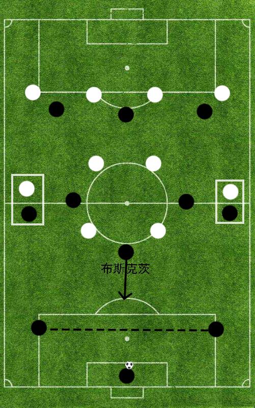 通常情况来讲,即便对方的两名前锋将位置积极上压参与逼抢,也很难限制巴塞罗那后场多达4名球员的进一步传球尝试。在这样的背景环境之下,不少球队会被迫将双中前卫其中之一的位置推到前锋线,以图能够协助两名前锋对于巴塞罗那的由后向前传递形成干扰限制。这样一来,瓜迪奥拉命令布斯克茨回撤到后卫线进行拿球的目的便完全实现:巴塞罗那在中场区域获得了更加明显的人数优势,一旦哈维、伊涅斯塔其中之一可以获得皮球,就可以在非常从容的状况下和前场的梅西等人形成直接连线。
