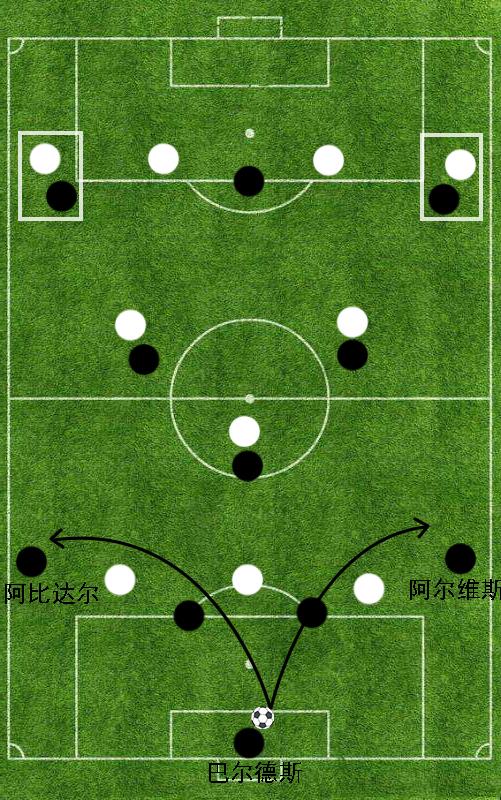 如上图所示,左边锋7号比利亚以及右边锋17号佩德罗在无球状态下并不会放松警惕,而是会积极调动身位对于对手的两名边后卫形成压制。这样一来,考虑到433阵型在中场人手不足的局限性,巴塞罗那的两名边后卫便有了更大的接球空间。当后场的皮克等人将皮球转移到边后卫脚下时,无论是阿比达尔还是阿尔维斯都可以在短时间内获得更多的选择:他们既可以选择内切和中路的哈维、伊涅斯塔等人形成更加默契的小范围配合,也可以进一步向前,和己方边锋形成2对1有效进攻局面。