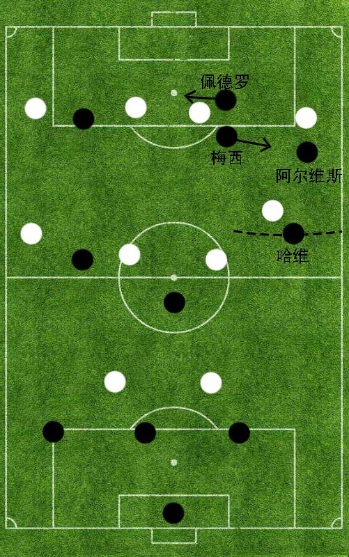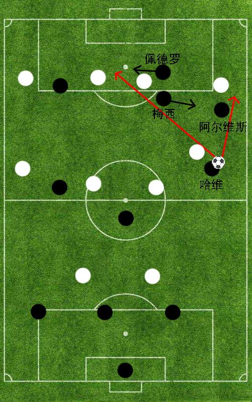 简而言之,瓜迪奥拉在巴塞罗那阵地进攻过程中会命令佩德罗以及梅西这两位球员的位置进行互换。这样的战术策略既可以在短时间内对于对方的后方防守布局形成有效搅乱,也能够将梅西在边路的强大突破能力进一步发挥出来。与此同时,为了保护右边后卫高度压上后所暴露的身后空档,瓜迪奥拉会命令6号哈维在阿尔维斯拿球后拉边。这样一来,即便阿尔维斯和梅西在右路的二过一配合出现失误,埋伏在中场区域的哈维也能够第一时间上抢形成干扰,给予阿尔维斯充足的回防时间。