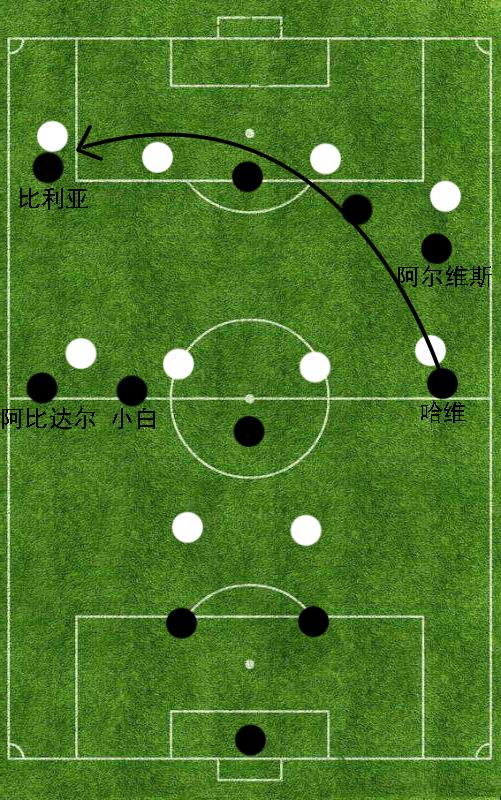 答案当然是否定的,阿比达尔的进攻能力虽然不如阿尔维斯,但他的勤勉的跑动穿插以及积极的牵扯也能够侧面为左路进攻带来帮助。如上图所示,阿比达尔在进攻过程中的压上幅度远不如阿尔维斯那么深入,他更多的责任是在中场区域牵扯对方边锋或者边前卫,侧面解放己方中场球员伊涅斯塔。当伊涅斯塔获得足够的持球跑动空间时,这位西班牙国脚会积极拉扯到边路,和左边锋比利亚形成局部范围内的两人连线。