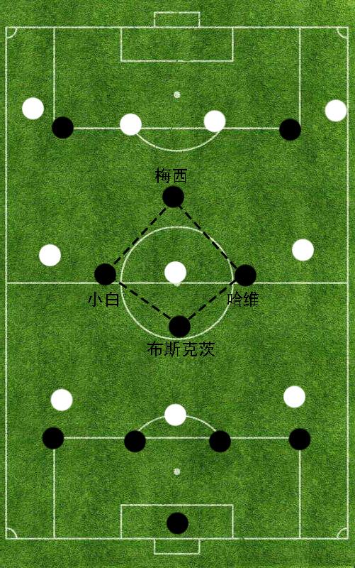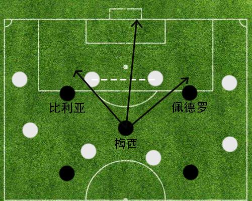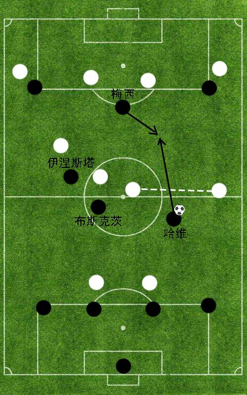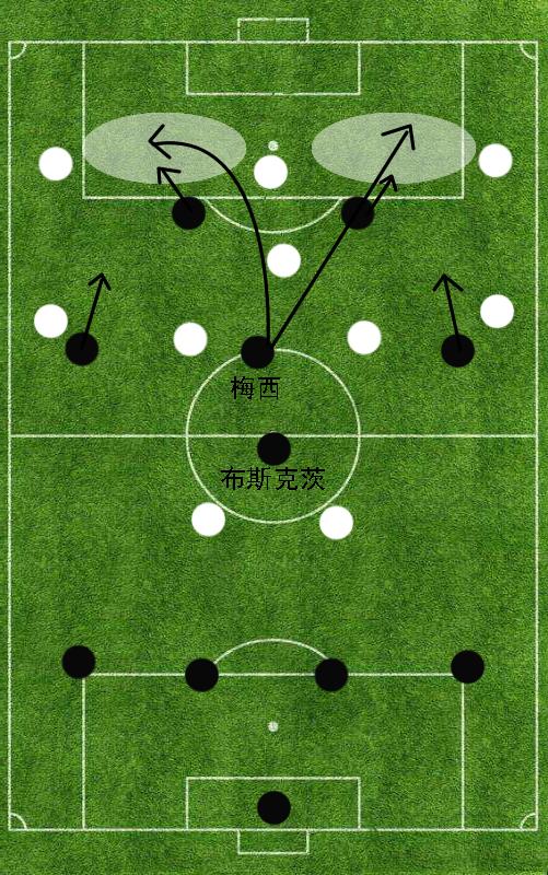我们来看上面这一张图片,布斯克茨、哈维、伊涅斯塔很少会利用自身个人能力进行强行突破过人,而是会倾向于使用相互之间的反复横传调度对方中场球员的站位,从而在局部范围内获得足够的空间进行更加激进的传球。当中场三人组通过反复传递获得足够出球空间时,善于回撤接球的梅西就将成为对方后卫的噩梦。众所周知,梅西在场上的位置非常灵活,他非常善于在对方中后场之间进行反复穿插要球。