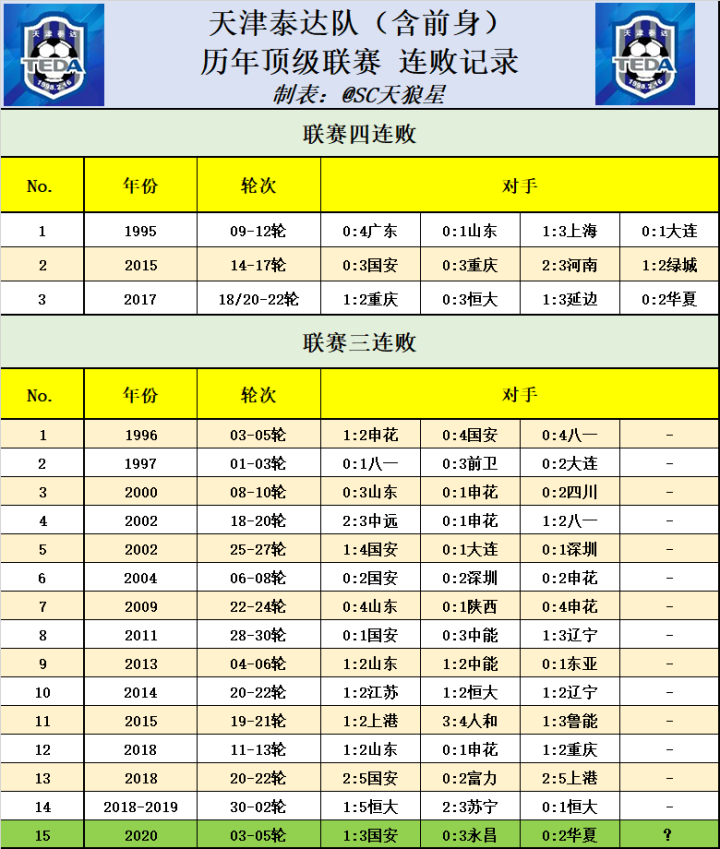 如果不把四连败算在内的话,这是泰达队史顶级联赛第15次三连败。