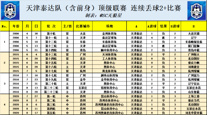 这也追平了泰达队的一项记录,即职业化以来,顶级联赛连续五场,至少丢两球。