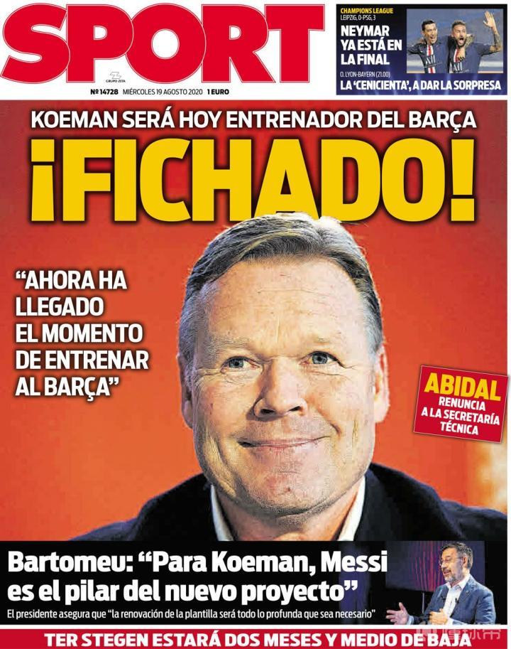 北京时间8月19日凌晨,巴萨主席巴托梅乌确认罗纳德-科曼将会成为球队的新任主帅,这位荷兰教头也成为了《每日体育报》今日的封面人物。
