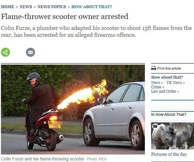 被抓的原因,是他在摩托车后边加了一个火焰喷射器,看起来差点烧了后边司机的油箱。