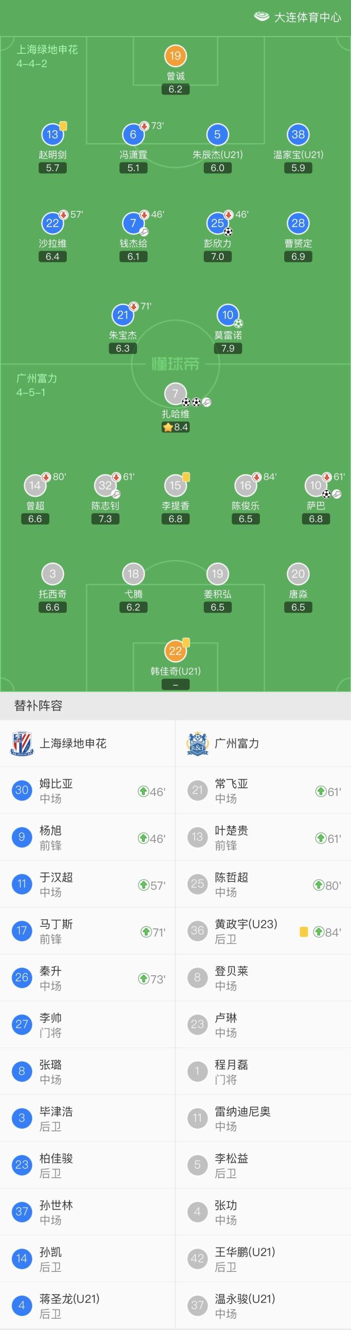 上海绿地申花首发:19-曾诚、5-朱辰杰(U23)、6-冯潇霆(73'26-秦升)、13-赵明剑、21-朱宝杰(69'17-马丁斯)、38-温家宝(U23)、25-彭欣力(46'9-杨旭)、28-曹赟定、7-钱杰给(46'30-姆比亚)、10-莫雷诺、22-沙拉维(56'11-于汉超)