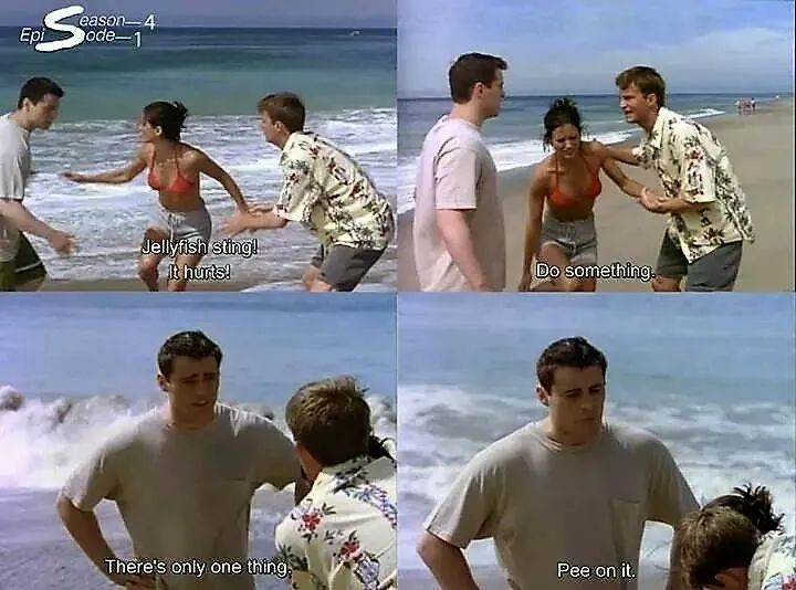这一应急措施在民间的迅速传播,无疑源自《老友记》里莫妮卡在海滩被水母蜇伤后,乔伊的解决方案。