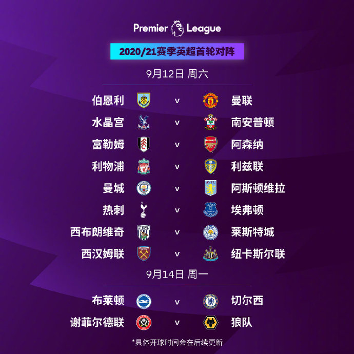 罗掌柜体育北京时间8月20号的下午4点,2020-2021赛季的英格兰足球联赛也公布了赛程,在首轮比赛中,传统的big6集团分别对阵:布莱顿VS切尔西、热刺VS埃弗顿、曼城VS阿斯顿维拉、富勒姆VS阿森纳、伯恩利VS曼联、利物浦VS利兹联。