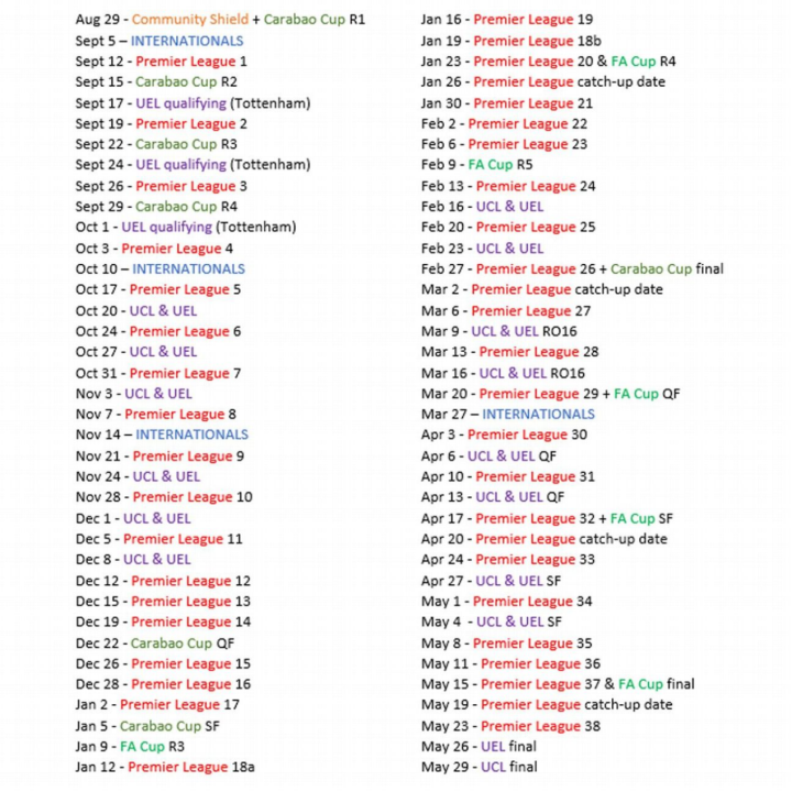 同时,在9月12日的周末踢完第一轮球之后,英超的比赛基本上是不间断的,只有加起来四周的闲暇时间给予球队们休息以及调整,直到2020年的5月29日欧洲冠军联赛决赛,所有的这些周中的时间(比如周一、周二、周三、周四)都需要安排英超联赛的比赛,以便下赛季的英超比赛能够顺利完成。