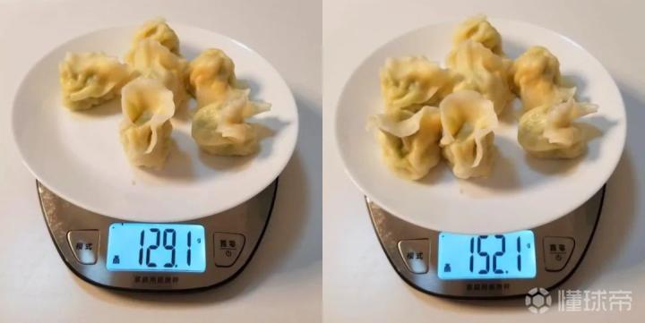 我们买了一份饺子,分别称了6个饺子和7个饺子的重量,6个饺子有129.1克,而7个饺子有152.1克,有二两半到三两重。