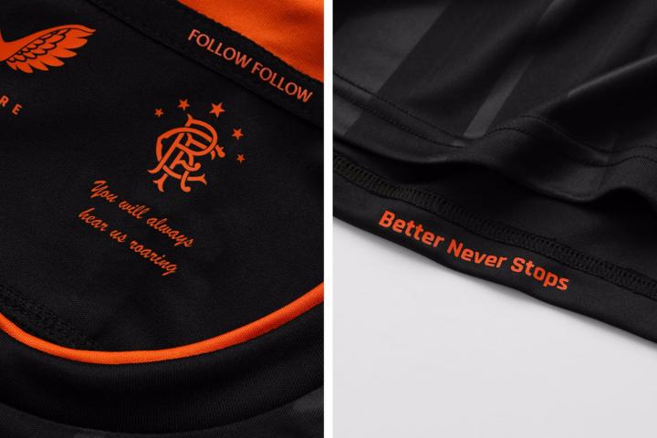 圆领内除了加入俱乐部徽章外,衣领包带上还加入口号“Follow Follow”,而源自球迷助威歌曲的短句“You'll always hear us roaring”也出现在衣领内,激励身处客场的球员们全力以赴。此外,球衣下摆内侧也加入激励球员的口号“Better Never Stops”。这件全新第二客场球衣将搭配黑色球裤与橙色球袜,球裤两侧与球袜顶部分别加入橙色与黑色条纹装饰。