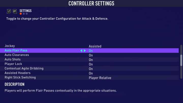 传球/射门取消 -L2 / LT + R2 / RT-允许您取消任何传球或射门请求,继续带球。